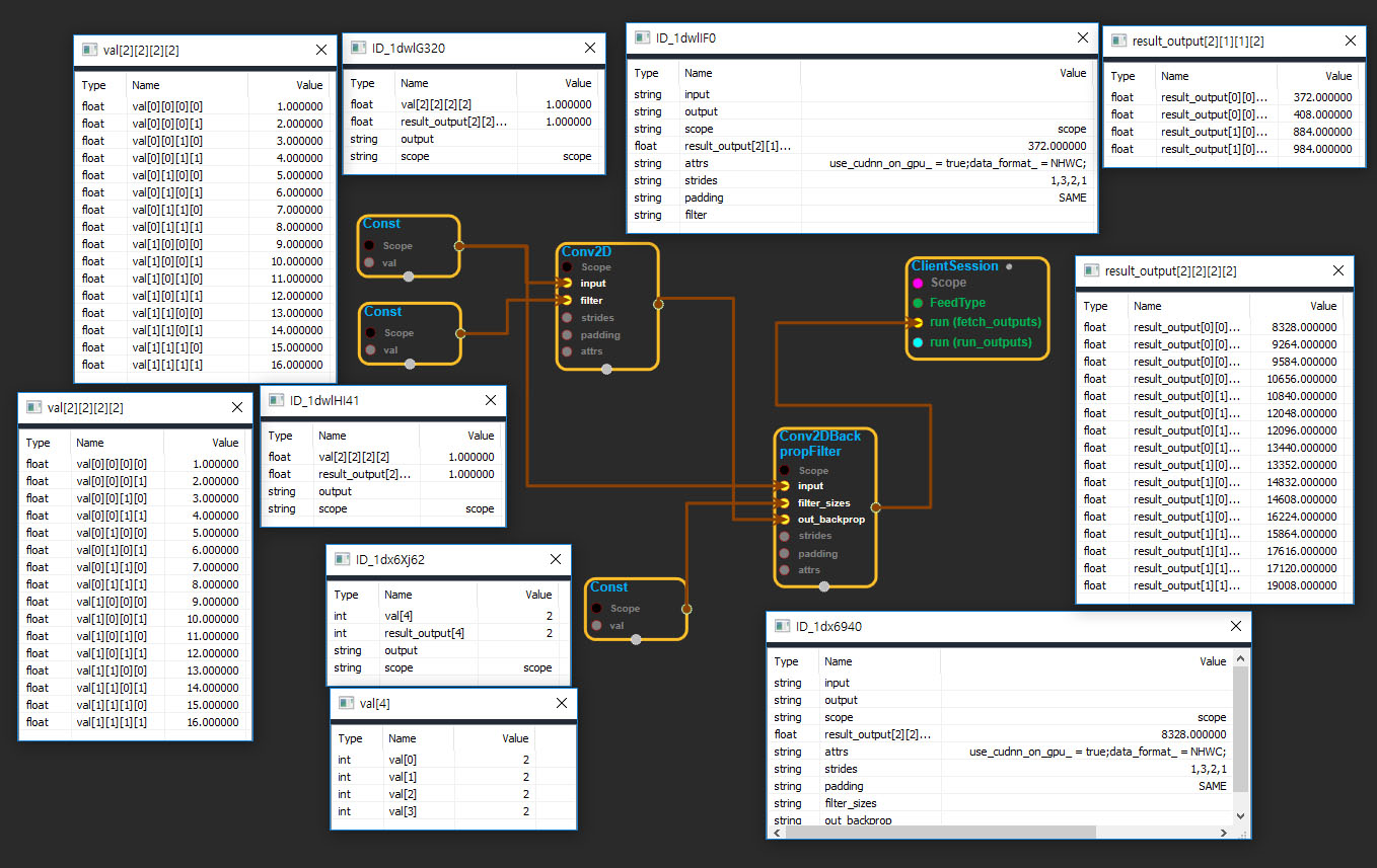 - Conv2DBackpropFilter ::Attrs attrs : Input attrs in value. ex) use_cudnn_on_gpu_ = true;data_format_ = NHWC;